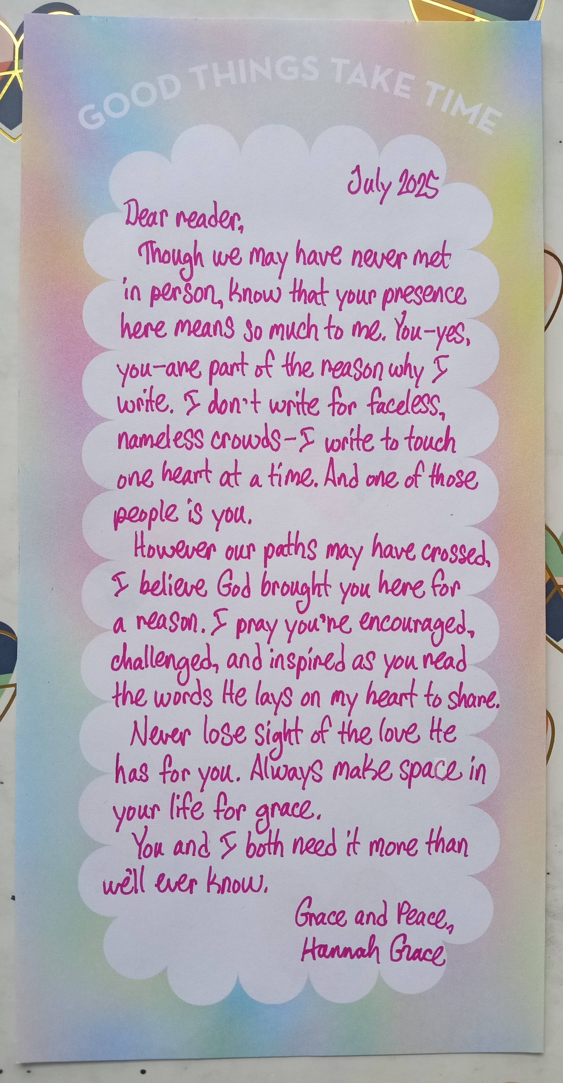 The Grace Space Why I Won't Be Blogging for a Few Months AUG. 28, 2025 / HANNAH GRACE I’ve decided it’s time to take a break from blogging for a little while. It’s not that I’m tired of writing. Far from it. The past several months have been wildly fruitful writing-wise, producing thousands of words’ worth of blog posts and newsletters, articles for blog swaps with fellow writers, and pieces to submit to print and online publications, plus a few other projects. And that’s just what has made...
